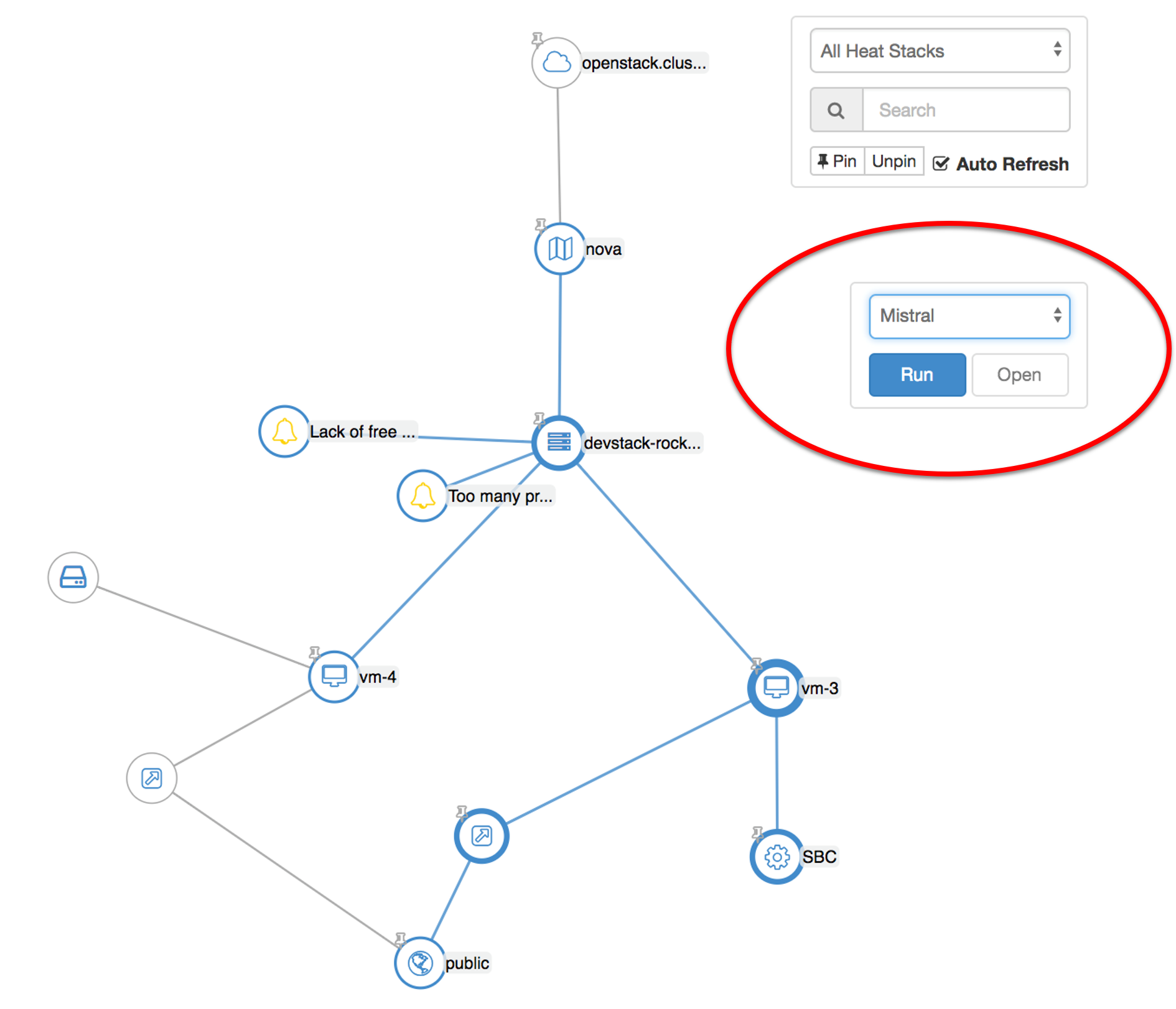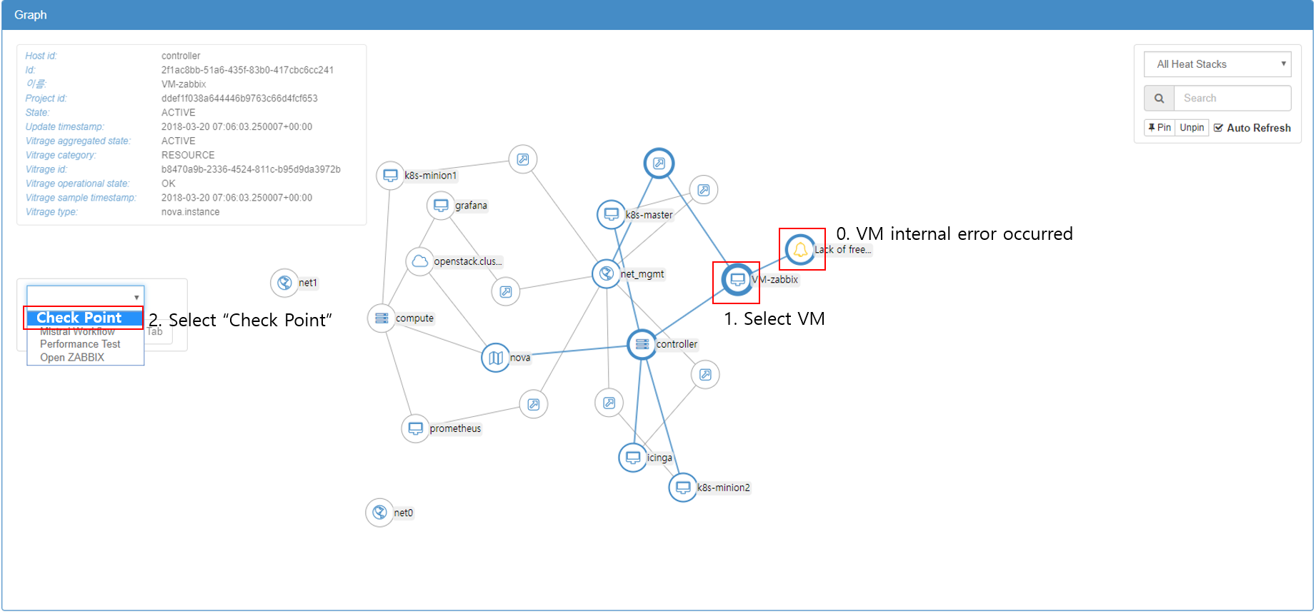 그림 1에서는 Vitrage가 제공하는 장애 원인을 상하위의 트리 구조로 시각화하는 탭입니다.[1] 이는 Horizon을 통해 확인할 수 있습니다. 시각화 탭에서는 장애 알람, 인프라 구성요소, 가상 머신을 한눈에 파악할 수 있습니다. 따라서 본 연구의 목표는 인프라, 가상 머신 등에 대해 장애가 발생하였을 경우 관리자 편의 도구들을 연동하는 패널을 만들어 제공하여 실시간으로 장애에 대응할 수 있도록 하는 것입니다. 따라서 장애 발생 후 즉시 패널을 통해 복구를 수행하거나 여러 가지 액션을 진행하는 것이 가능합니다.