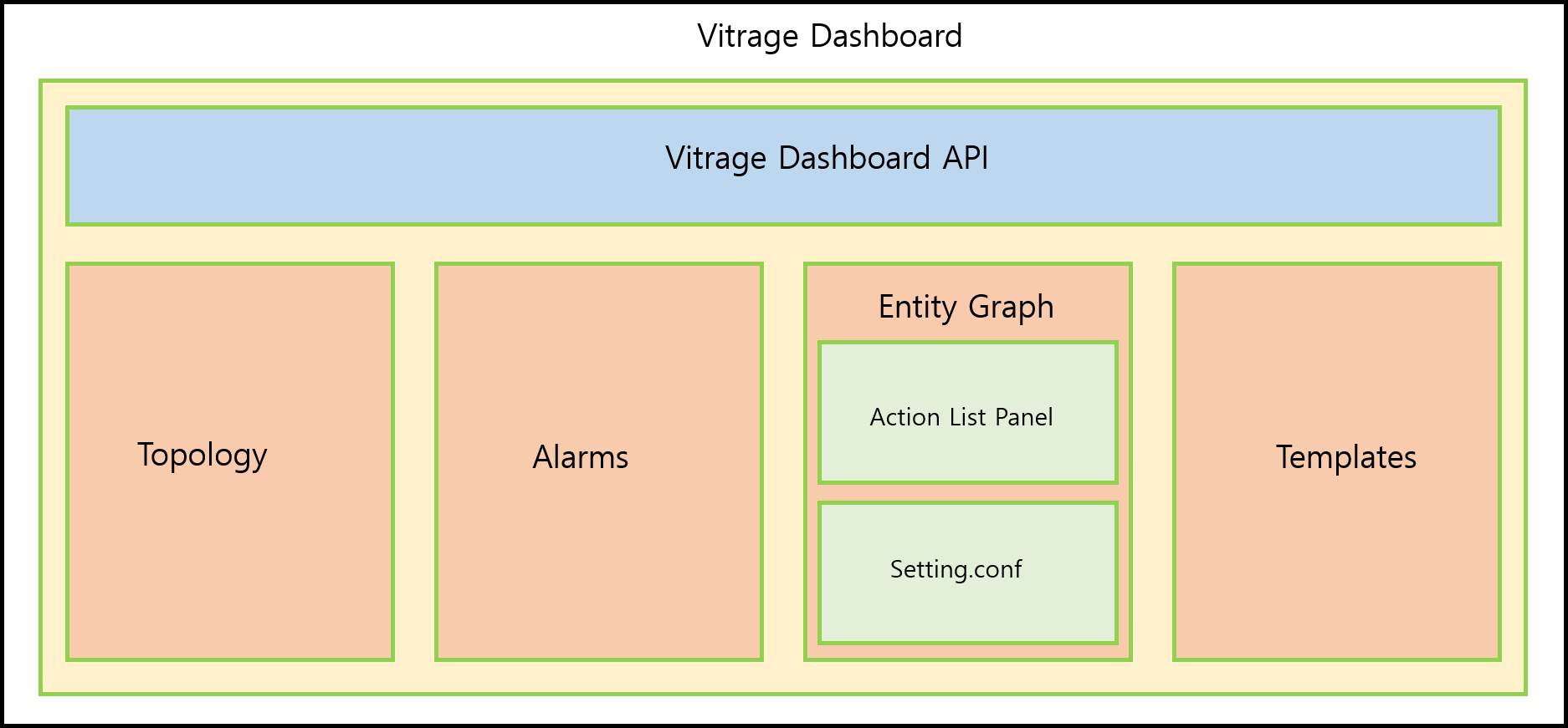 이번 포스팅에서는 예전에 연구했던 주제 중 하나인 고가용성을 제공하기 위해 여러 도구들을 통합하여 제공하는 패널을 개발한 내용 및 구현 결과를 말씀드리고자 합니다. 먼저 구조를 살펴보기에 앞서 본 개발 내용은 오픈스택 RCA(Root Cause Analysis) 프로젝트인 Vitrage를 기반으로 구현되었습니다. 기본적인 컨셉은 다음과 같습니다.